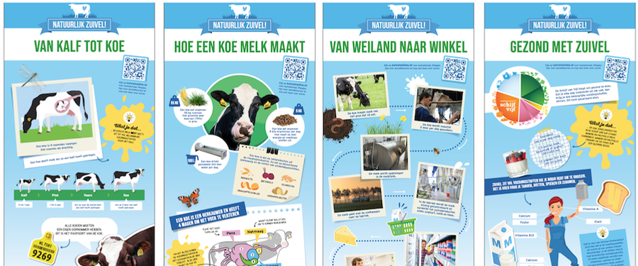 - Educatief: De banners helpen om de zuivelsector beter te begrijpen. Elke banner laat een ander deel zien, zoals koe en kalf en welke zuivelproducten in de Schijf van Vijf staan.
