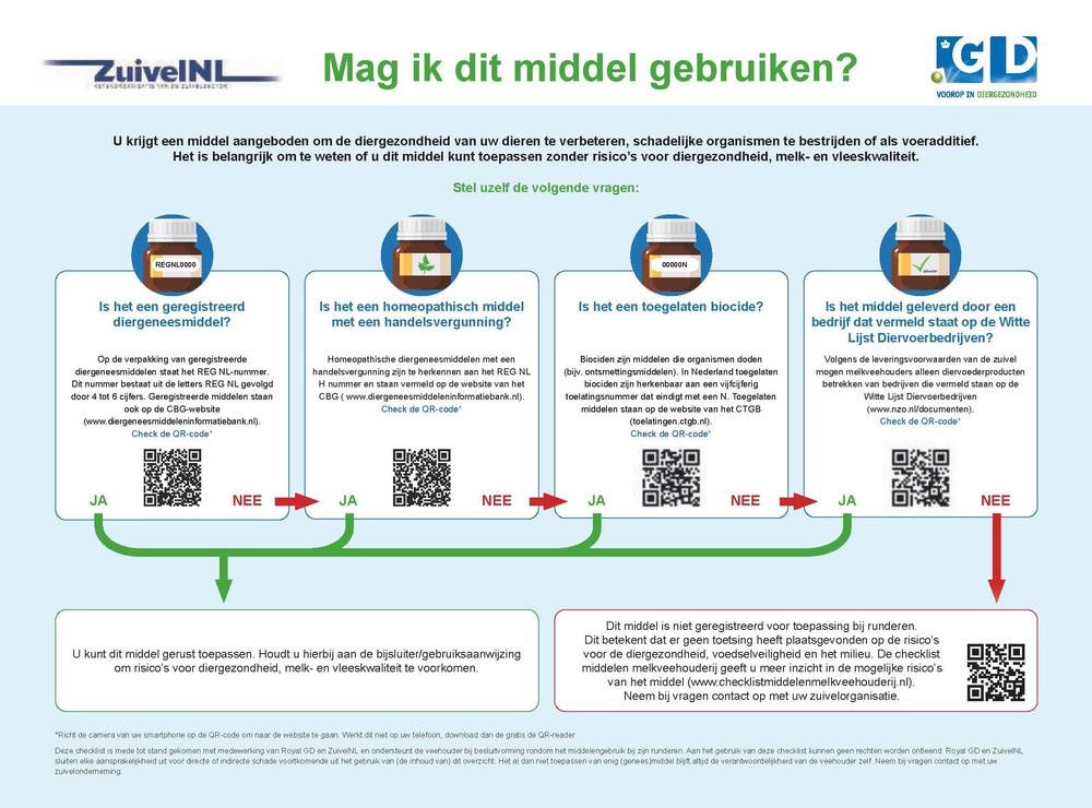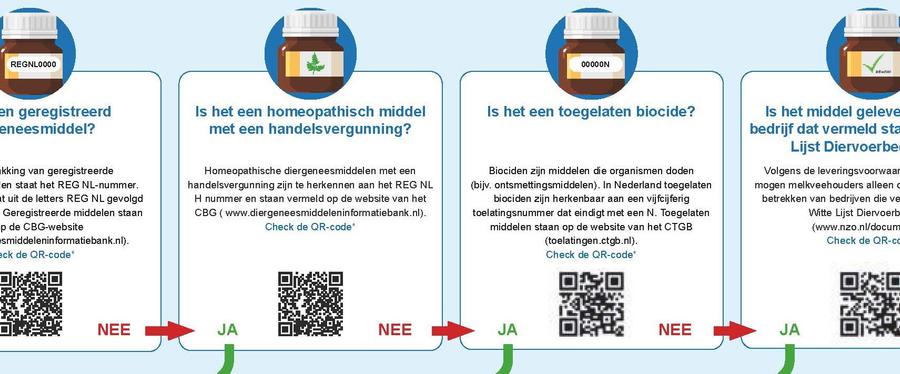 De poster kent een gemakkelijk stappenplan. Wanneer u een middel aangeboden krijgt om de diergezondheid van uw dieren te verbeteren, schadelijke organismen te bestrijden of een middel als voeradditief, is het belangrijk hiervan te weten of u dit middel kunt toepassen zonder risico’s voor diergezondheid, melk- en vleeskwaliteit. Door de QR-code van de categorie waartoe het middel behoort met uw telefoon te scannen zal u geleid worden naar het de zoekmachine waarin het middel, mits toegestaan, in opgenomen zou moeten zijn. Indien het middel geregistreerd is heeft u te maken met een veilig product welke volgens bijsluiter/gebruiksaanwijzing toegepast kan worden. Indien dit niet het geval is betreft het een middel dat niet geregistreerd is voor de toepassing bij runderen. Dit betekent dat er geen toetsing heeft plaatsgevonden op de risico’s voor diergezondheid, voedselveiligheid en het milieu. Voor vragen over een specifiek middel kunt u contact opnemen met uw zuivelonderneming.