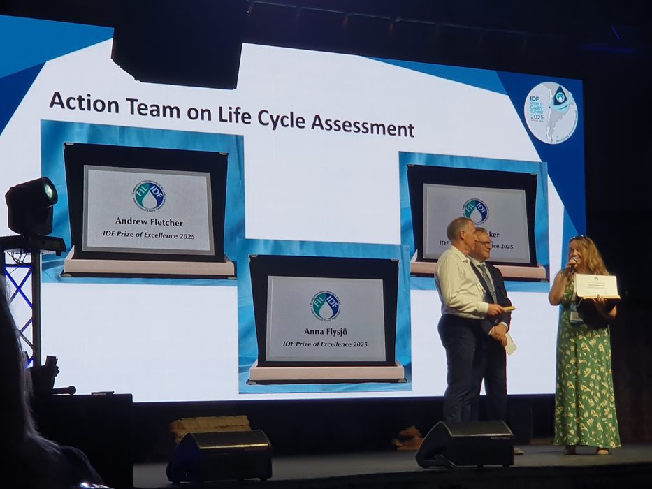 Jamie Jonker, uittredend voorzitter van de wetenschappelijke programmacommissie van IDF, reikte de prijs uit als blijk van waardering voor haar uitmuntende bijdrage aan het werkprogramma van IDF op het onderwerp Life Cycle Assessment.
