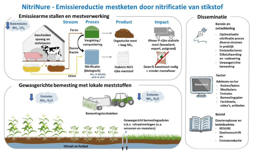 NutriNure richt zich op emissiereductie van stikstof en methaan in de gehele mestketen van stal tot gewas via optimale verwerking van meststromen tot hoogwaardige kunstmestvervangers. Hierbij wordt dierlijke urine en feces aan de bron gescheiden en verwerkt met een innovatief proces.