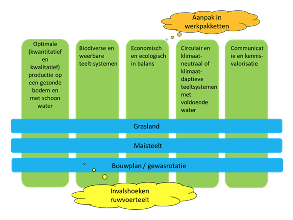 De teelt van ruwvoer is cruciaal voor de melkveehouderij. Bodemgebruik en -beheer, gewasmanagement en gewas- en rassenkeuze hebben grote invloed op ruwvoerproductie, broeikasgasemissie, koolstofopslag en emissies. Bij de te maken keuzes spelen de afbouw van dierlijke mest, koolstofopslag, weersextremen en afname van biodiversiteit een belangrijke rol. Verdere optimalisatie van ruwvoerteelt met behoud van ruwvoerkwaliteit is noodzakelijk, met aandacht voor o.a. biodiversiteit, stikstof, gewasbescherming en bouwplan.