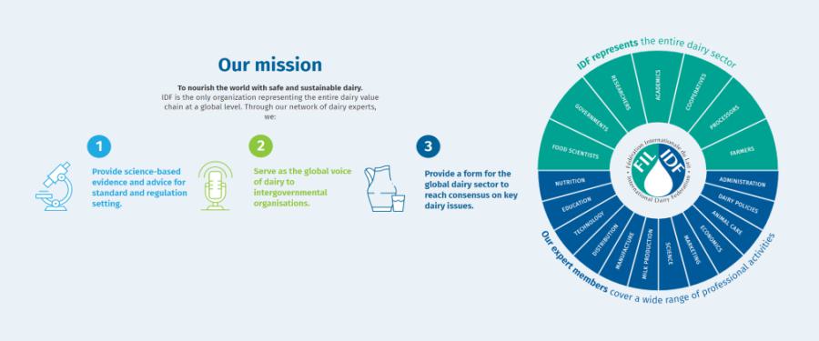 Als toonaangevende organisatie voor de mondiale zuivelsector, speelt IDF een belangrijke rol om ervoor te zorgen dat op het terrein van beleid, standaarden, toegepaste praktijken en regelgeving de juiste keuzes worden gemaakt om bovenstaand doel te realiseren.