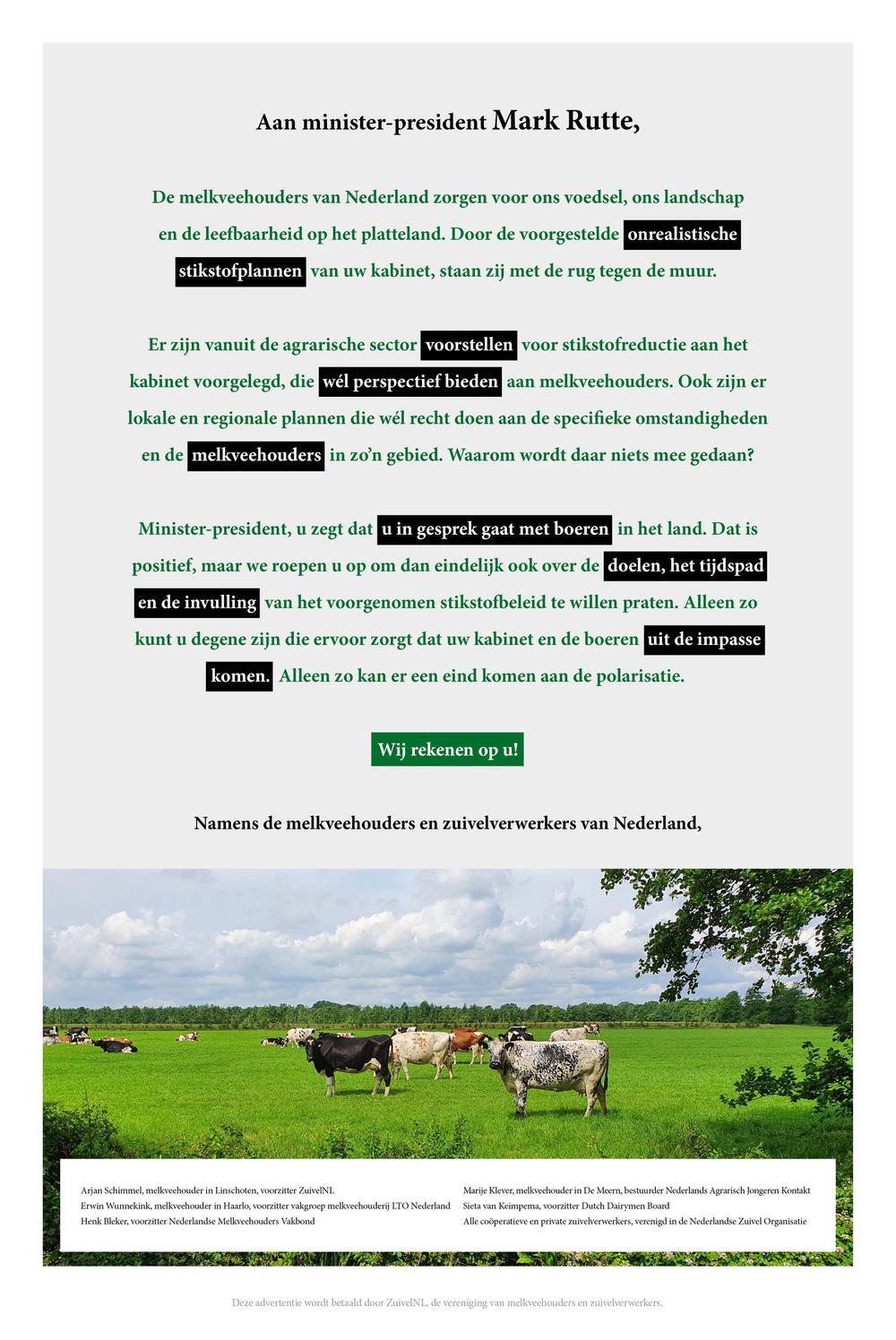 Dinsdag 12 juli verschijnt in landelijke dagbladen een open brief gericht aan minister-president Mark Rutte. In de brief wordt de minister-president opgeroepen om eindelijk ook met de melkveehouders te praten over de doelen, het tijdspad en de invulling van het voorgenomen beleid voor stikstof, klimaat, water en mest.